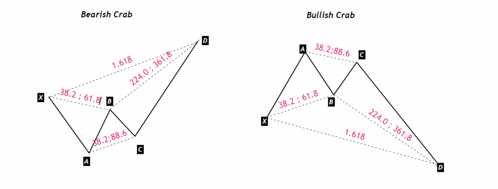 Yengeç harmonik formasyonu, Kelebek formasyonuna benzer ancak daha fazla uzama içerir. Görünüm olarak yana doğru gerilmiş bir Kelebeği andırır. Bu formasyonda, son fiyat hareketi (CD), ilk hareketin (XA) ötesine geçer ve bu nedenle Fibonacci uzatma seviyeleri kullanılır. Desenin tanımı, belirli Fibonacci oranlarına dayanır.