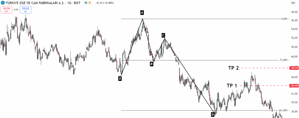 Crab harmonik formasyonunda hedef bölgeler, CD bacağından çekilen Fibonacci geri çekilme seviyelerine göre belirlenir. İlk hedef bölgemiz %38,2 , ikinci hedef bölgemiz ise %61,8 Fibonacci seviyeleridir. Grafikte görülen 1. hedefi almış fakat 2.ye nefesi yetmeyip hisse aşağı yönlü hareketine başlamış .