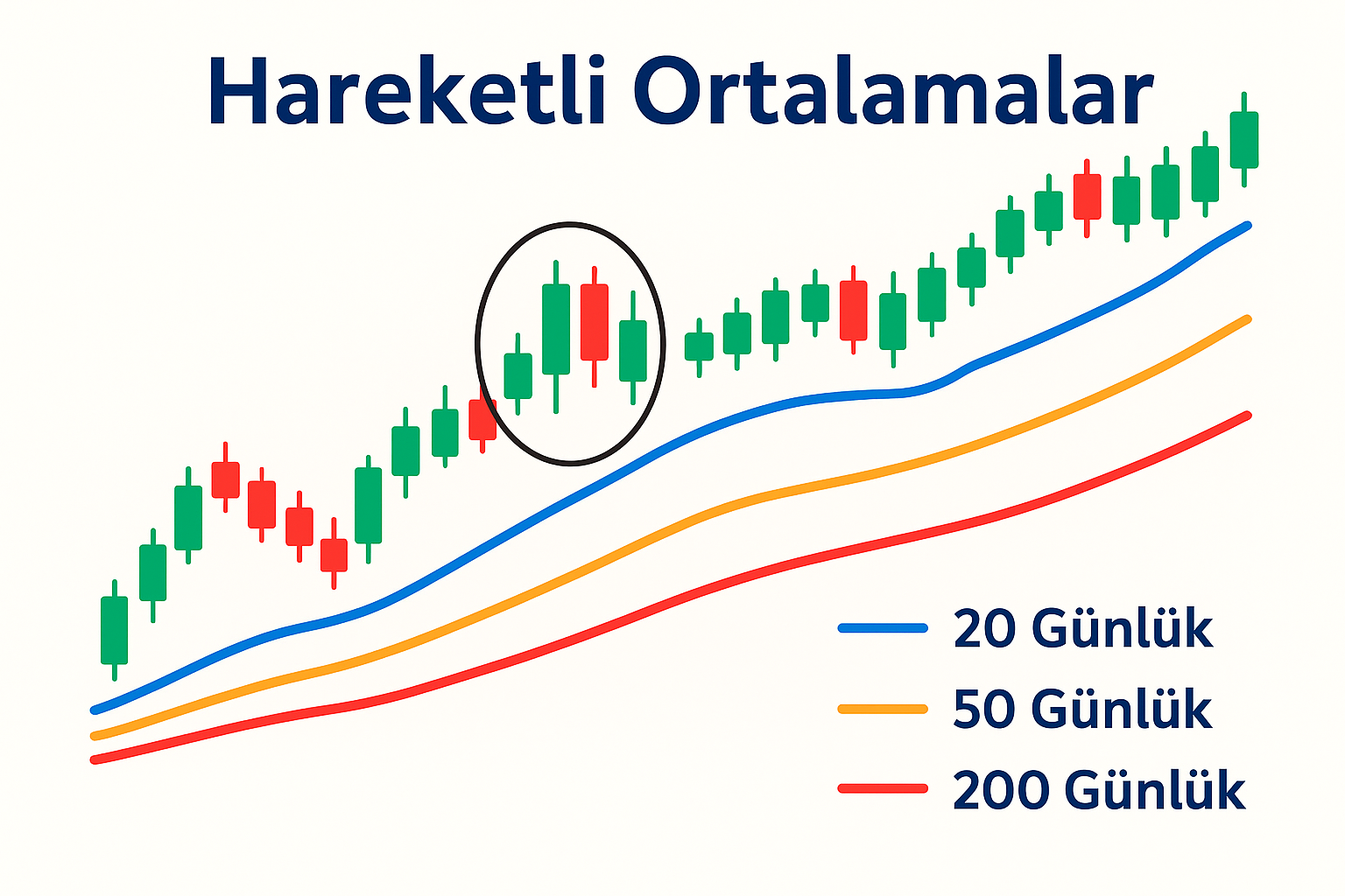 Fiyat, hareketli ortalamanın üzerindeyse yukarı trend, altındaysa aşağı trend olabilir. Sadece hareketli ortalamaları baz almak, en basit trend takip yöntemlerinden biridir. Piyasalarda zaman geçirdikçe fark edeceksiniz ki, bazen yalnızca bu ortalamaları kullanarak bile kazanç sağlayabilir ya da büyük kayıpların önüne geçebilirsiniz.