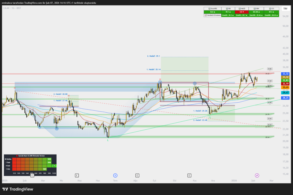 Grafiklerde belirgin bir yükseliş kanalı oluşumu dikkat çekiyor. Fiyat, 2025 yılının ikinci yarısından bu yana sistematik bir şekilde üst seviyelere tırmanıyor. İlk grafikte (TradingView) belirtilen hedef seviyeler 35,14₺ (1. Hedef) ve 39,10₺ (2. Hedef) olarak işaretlenmiş durumda.