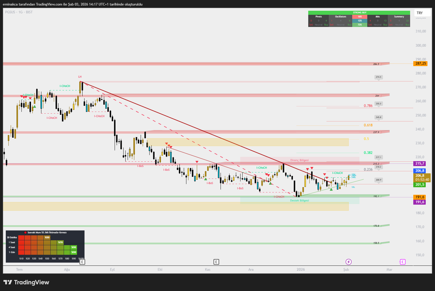 PGSUS, güçlü bir düşüş sürecinin ardından dip bölgesinde toparlanma sinyalleri üretmeye başlamış durumda. Ancak bu hareket şu aşamada tepki yükselişi niteliğinde.