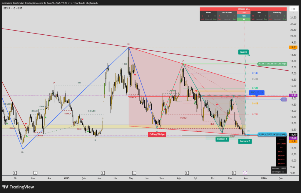 BESLR, son aylarda güçlü bir satış baskısı ile çoklu dip seviyelerine yaklaşmış durumda. 12,10₺ bölgesi kritik destek konumunda; RSI aşırı satımda, hacim zayıf ve orta vadeli trend halen aşağı yönlü. Kısa vadede tepki yükselişi olasılığı mevcut olsa da, ana trendin yön değiştirdiğine dair bir sinyal oluşmuş değil.📉 1) Teknik Analiz